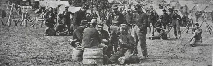 Our winter quarters at the end of 1863 was near Stevensburg in Virginia. The entire 2nd Corps was amassed at the place. It was countryside mostly, with small villages populated by old families. There were, as one might expect, few sympathizers with our side of things. Four of us had constructed a crude but usable cabin out of rotten fence posts and whatever sickly wild timber was left standing in the direct region. That was myself and Joe Musser, from Aaronsburg, and both Lanich brothers, Henry and Perciva, who both still lived and worked their family land outside of Coburn. Each of us had been faintly acquainted with the other before the war had come, but now that we were all in it there seemed to be a natural current that swept us together like four trout in a rough spring brook. Our place had a wood-burning chimney attached and two bunks constructed by Henry, who seemed to know just how to utilize even a discarded cigar button for good use.